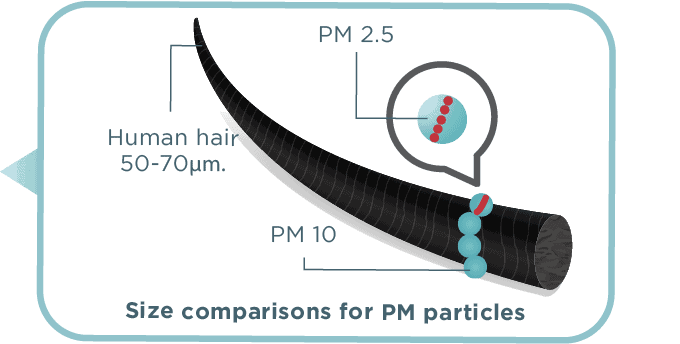 How small is PM2.5? Think about a single strand of hair, from your head. PM2.5 is almost 30 times SMALLER than an average strand of human hair (70 micrometres in diameter).